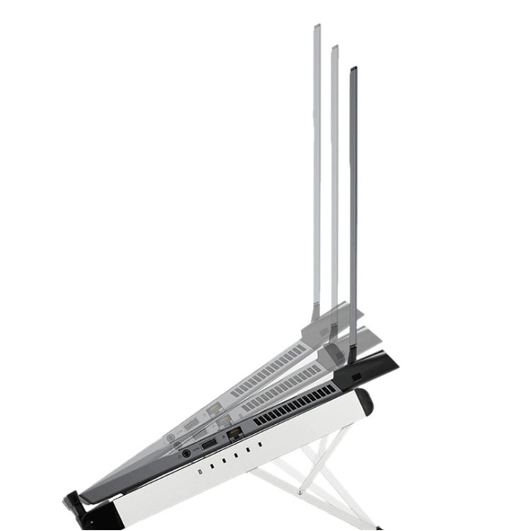 Hierdie skootrekenaarstaander bied vinnige en naatlose opening van een sekonde met sy gladde glylaer-ontwerp. Gemaak van duursame en esteties aangename aluminiumlegering, spog dit met 'n slanke voorkoms. Met ses verstelbare hoogtes kan jy die hoek aanpas wat by jou behoeftes pas, en die robuuste driehoekige steun van aluminiumlegering agter verseker stabiliteit, wat tik wankelvry maak. Die verstelbare skerm akkommodeer skootrekenaars van verskillende diktes, en jy kan kies uit twee elegante kleuropsies: Swart en Wit.
